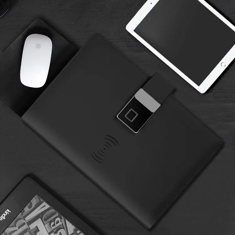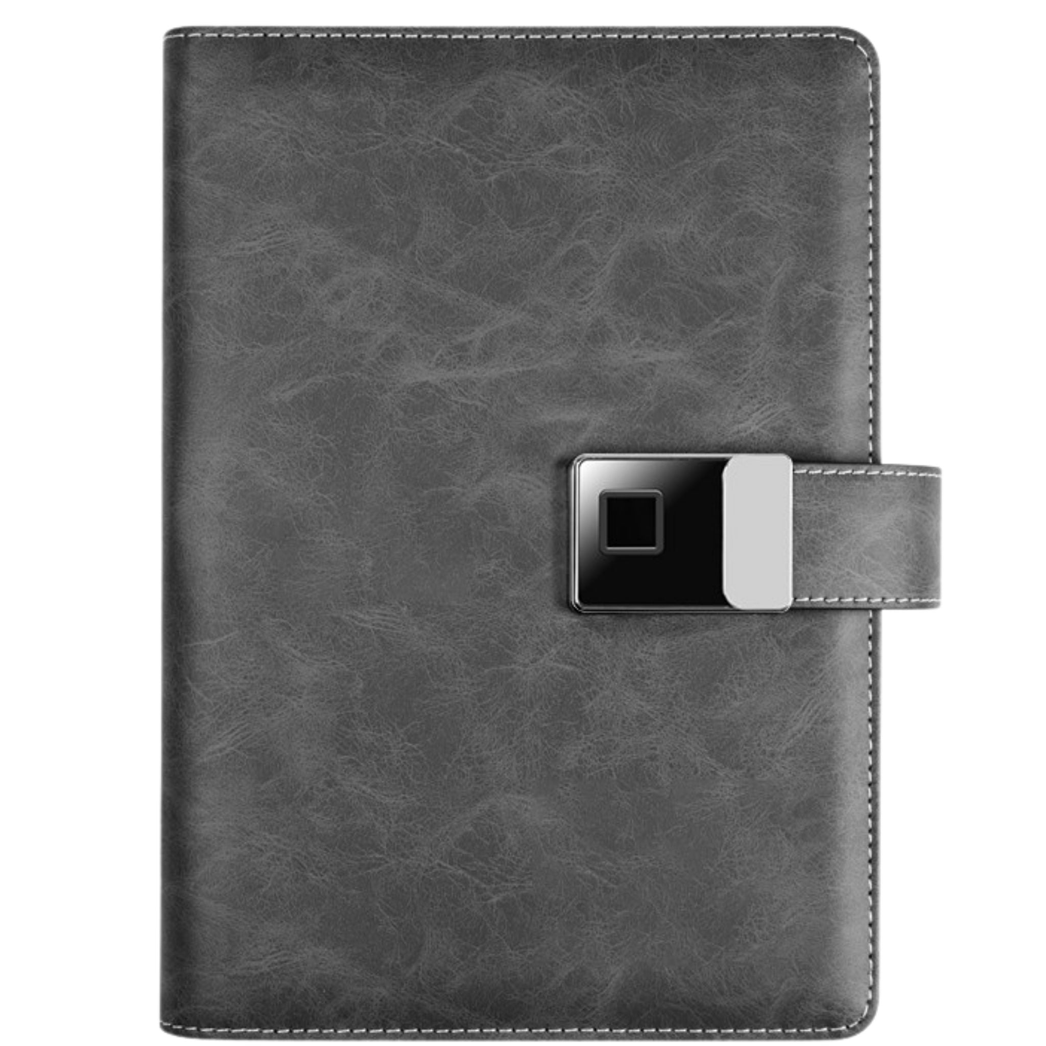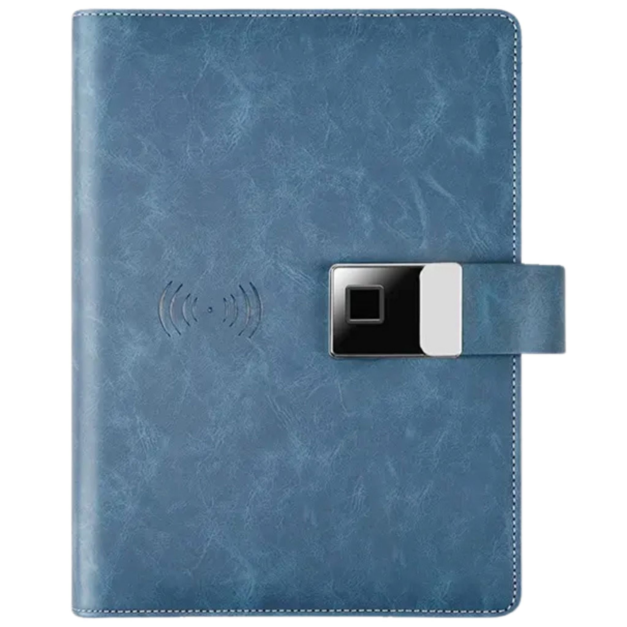 This sleek leather-bound notebook is more than just a place to write. It features a built-in wireless phone charger, a secure fingerprint lock to protect your private notes, a hidden USB flash drive, and a matching premium pen for smooth, effortless writing.
